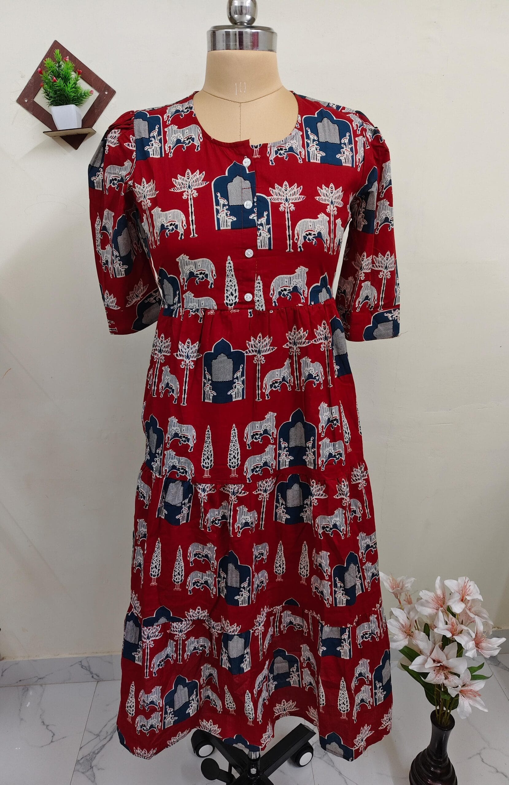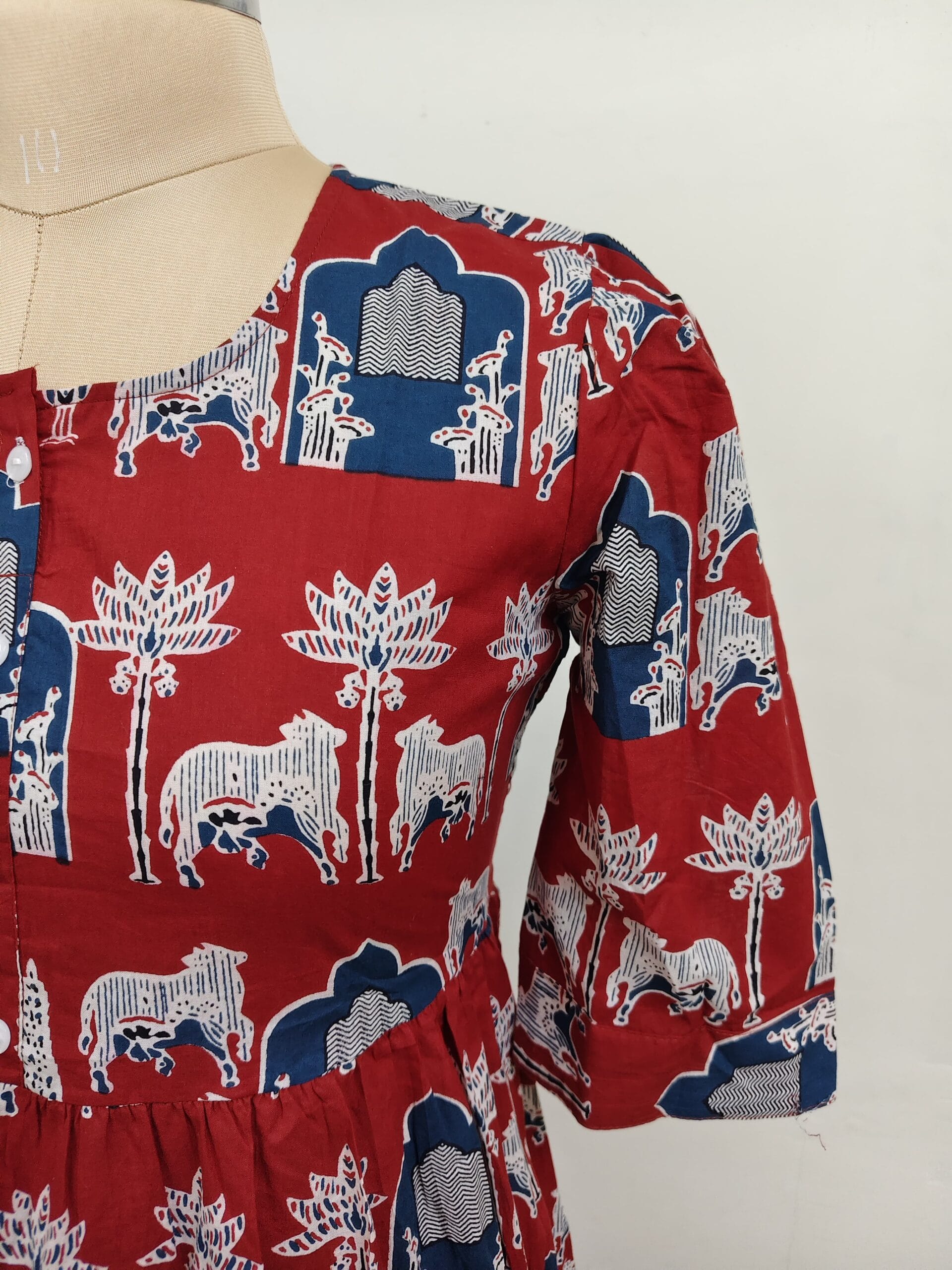 pure cotton frock with round neck pattern and elbow sleeves.
